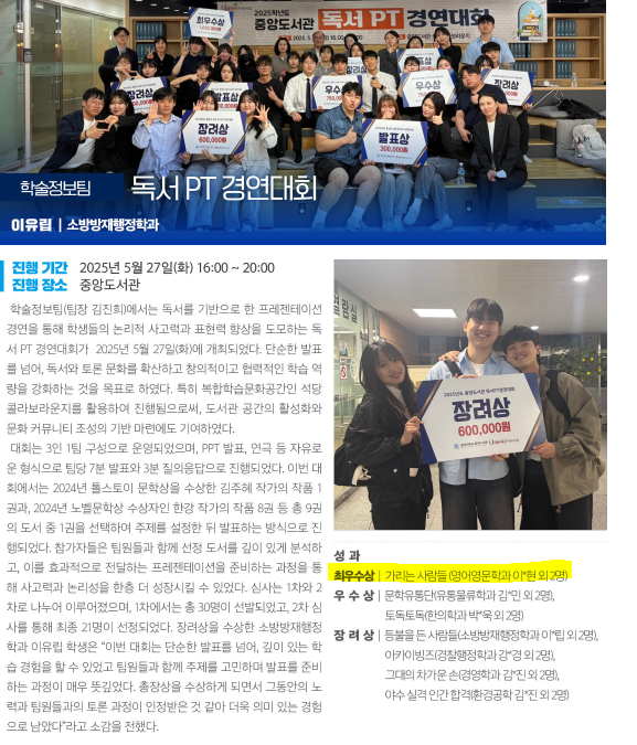 중앙도서관 독서 PT 경연대회 프로그램_ 영어영문학과 학생들의 눈부신 활약