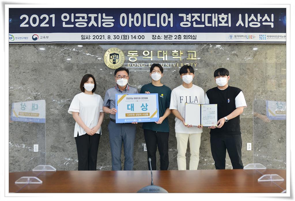 동의대(총장 한수환) LINC+사업단(단장 이임건) 빅데이터인공지능센터(소장 김성희)는 지난 8월 30일 오후 2시, 동의대 본관 2층 회의실에서 ‘2021 인공지능 아이디어 경진대회 시상식’을 개최했다.