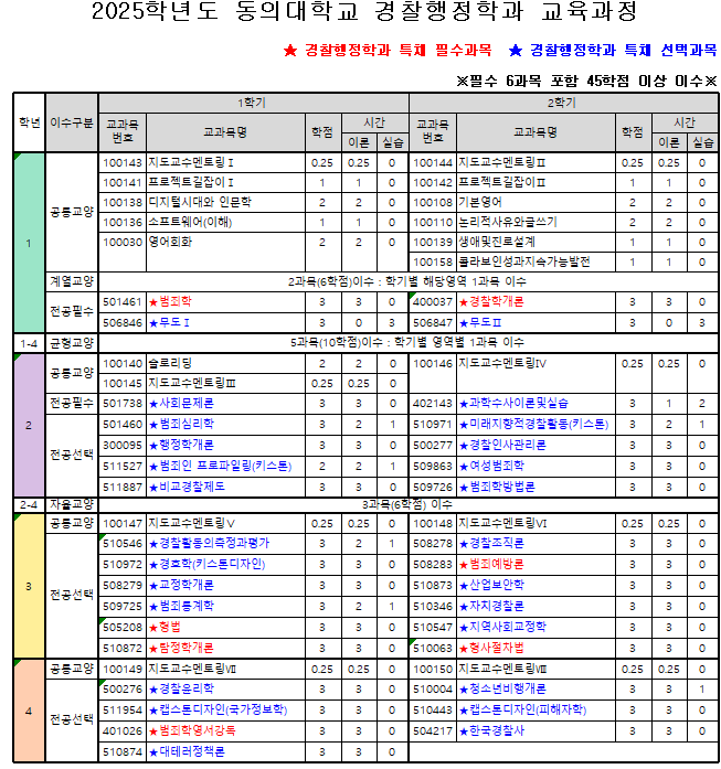 실습 교과목으로, 경찰관의 임무수행, 범죄의 예방과 진압에 필요한 신체의 단련과 범인체포 과정에서 발생할 수 있는 다양한 상황에 대한 실습을 할 수 있는 교과목입니다.